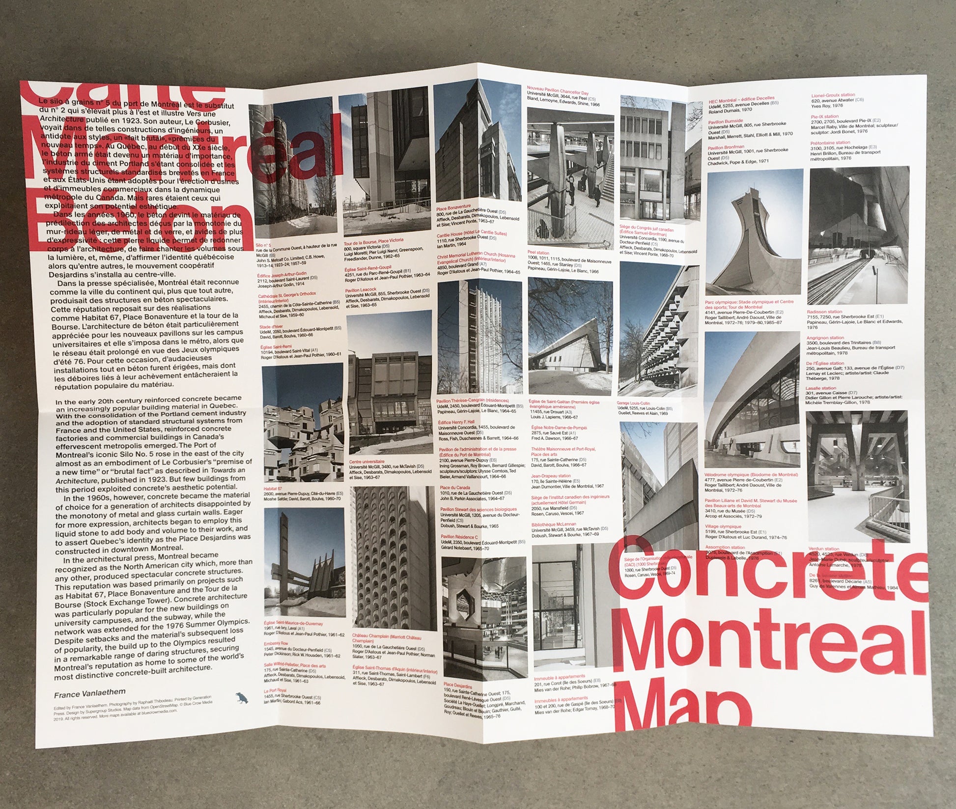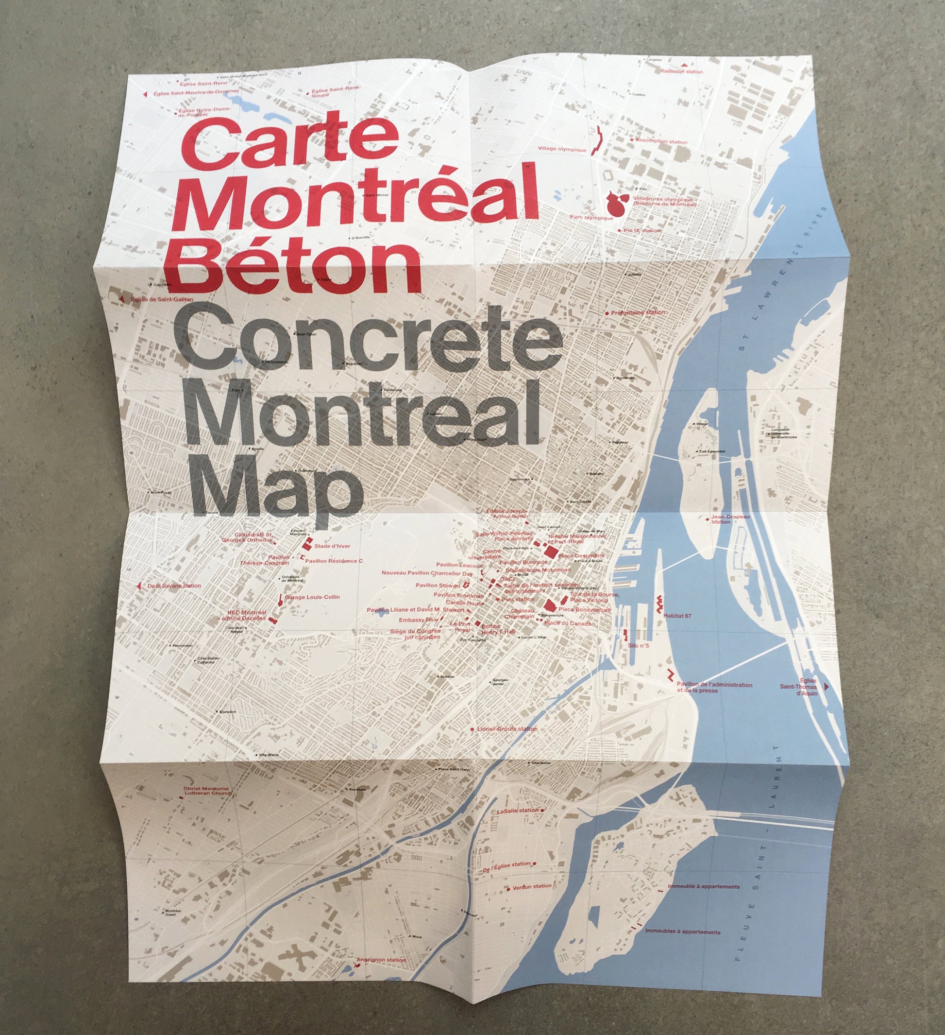 Concrete Montreal Map / Carte Montréal Béton features remarkable examples of concrete and Brutalist architecture in Montreal. This two-sided, bilingual guide by Professor France Vanlaethem includes a map, original photography by Raphaël Thibodeau, an introduction and details of fifty selected buildings, including celebrated concrete structures such as Habitat 67, Place Bonaventure, Tour de la Bourse, and a selection of Metro stations.