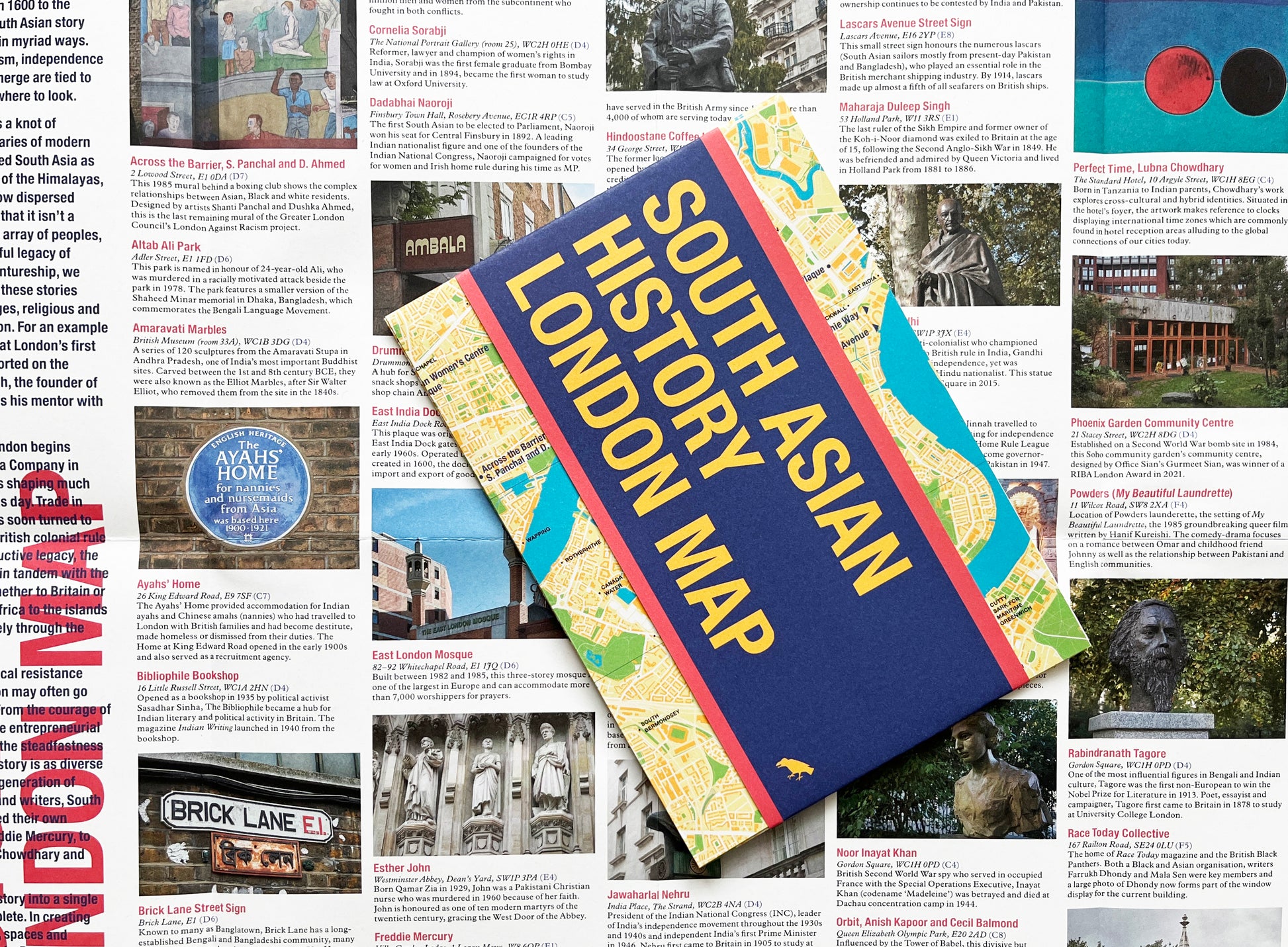 The map features fifty locations across London that tell the story of the city’s South Asian communities, from statues of Noor Inayat Khan and Mahatma Gandhi, to remarkable objects such as Tippoo's Tiger at the V&A and the Koh-i-Noor Diamond at the Tower of London. Places rich in meaning such as Brick Lane and Drummond Street are also included along with architectural masterpieces such as Neasden Temple. The result provides a unique perspective for the insightful explorer of London.